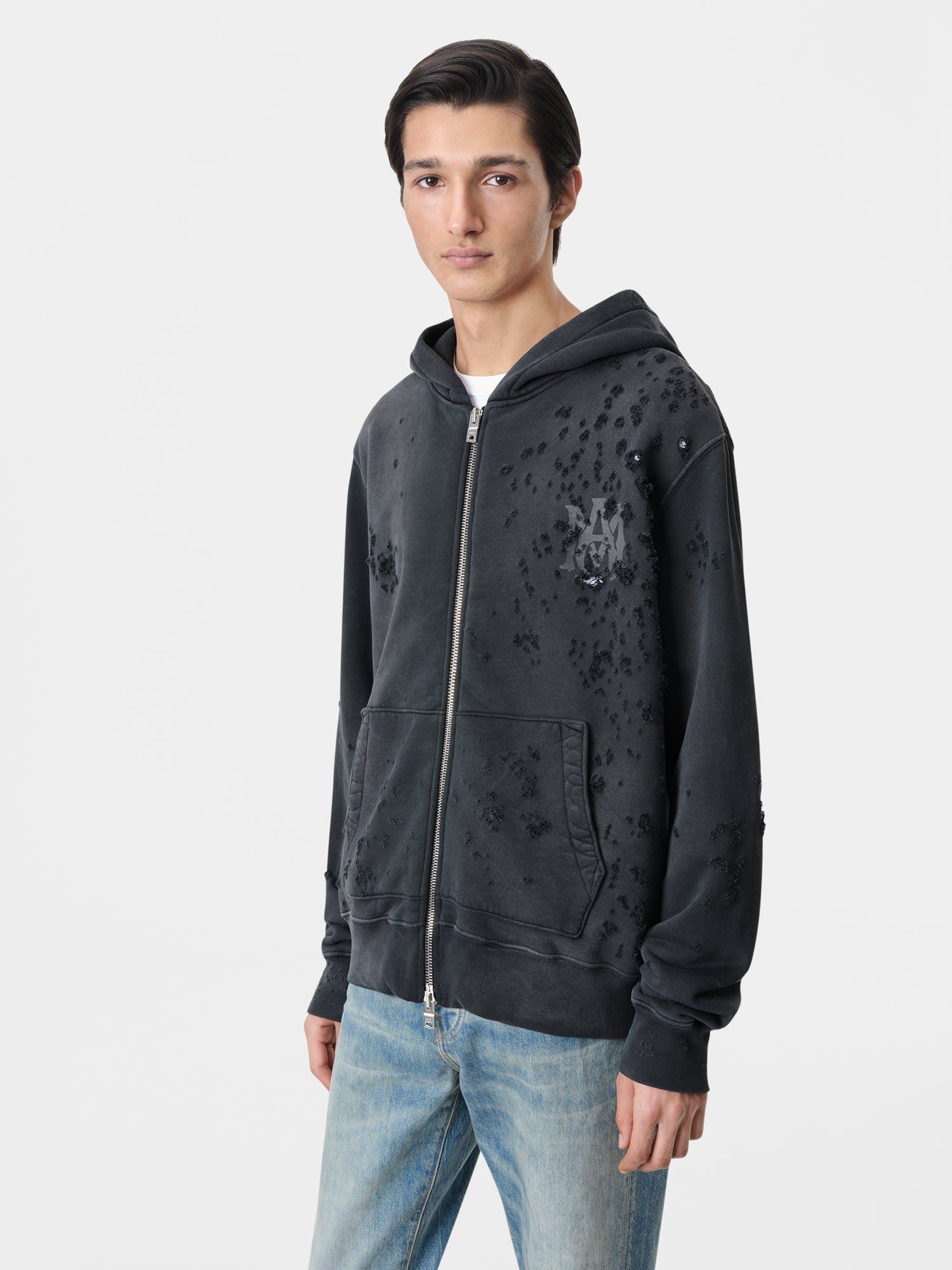 Forging new explorations in textural distortion, this hoodie is artfully distressed in a specialized battleworn treatment. This hoodie is crafted from soft, sturdy cotton specially washed for a well-worn effect and is finished with house logo accents. This hoodie complements house denim offerings, or wear with the MA Logo Shotgun Sweatshort for an striking yet understated look.