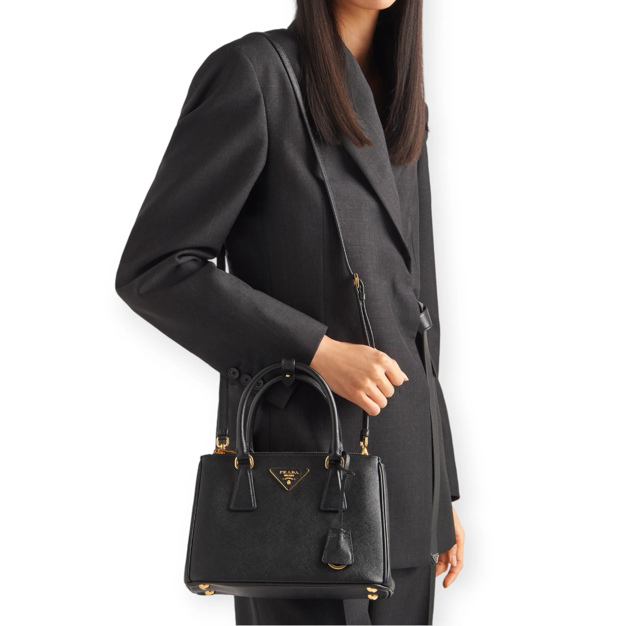 The Prada Galleria bag, which exemplifies Prada’s centennial excellence in luxury leather goods, becomes a reflection of the brand’s modernity and stylistic identity that seeks to interpret kaleidoscopic contemporaneity through a pragmatic design and structured lines. The accessory, presented in the small version, is made of iconic Saffiano leather that was patented by the founder of the brand and features a crosshatch texture and waxed finish. The Prada Galleria bag, named after the historic Prada store opened by Mario Prada in 1913 in Galleria Vittorio Emanuele II in Milan, expresses the quintessence of the brand’s timeless elegance.